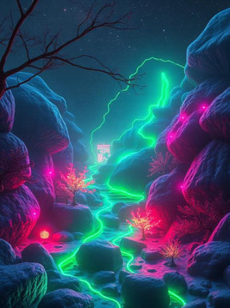Glowing river dark forest. Dark neon background. Created with Generative AI
