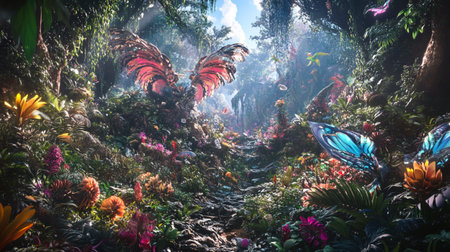 Fantasy garden with butterflies and flowers. 3D Rendering.