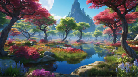 Beautiful fantasy landscape with pond, mountains and flowers. digital painting