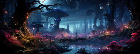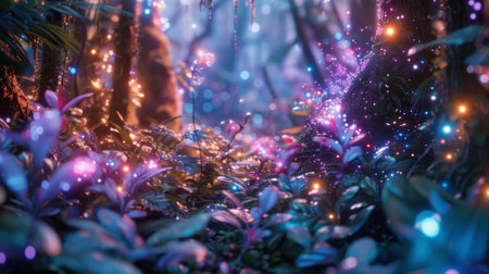 Fantasy forest at night with lights and flowers. 3d rendering