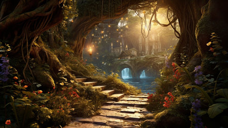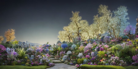 An AI illustration of A digitally created art piece depicting a lush, vibrant and enchanted garden landscape, with a myriad of trees, shrubs and plant