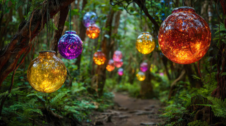 Vibrant orbs emit a gentle glow as they sway among towering trees, casting enchanting hues over a winding woodland trail at dusk's dreamy hour.