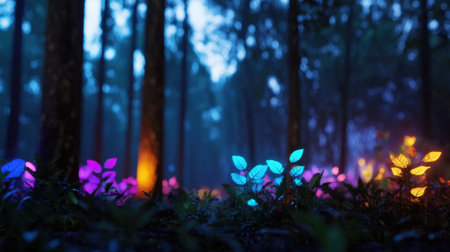 A forest at night with a vibrant and colorful display of leaves glowing in the dark. The leaves are illuminated with a variety of colors, creating a serene and peaceful atmosphere