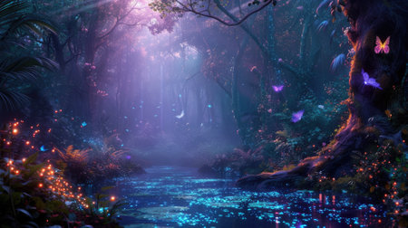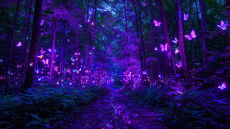 A mystical forest comes alive with glowing butterflies in shades of purple. The soft light casts a magical atmosphere among the trees as evening sets in creating a dreamlike path through nature.
