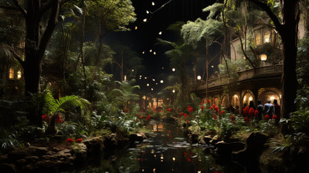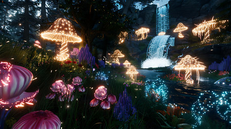 Fairy-tale garden with flowers and waterfalls at night.