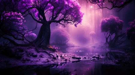 magical dark purple forest with undiscovered secret hiding place, created with generative ai