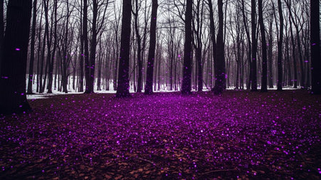 A dark and mysterious forest scene where the ground is covered in a carpet of fallen leaves that glow with an intense, vibrant purple light. Bare trees with dark trunks and branches rise up from the glowing foliage, creating a stark contrast. The atmosphere is enchanted and magical, with sparkling particles seemingly suspended in the air. evokes a sense of fantasy and the surreal, transforming a natural woodland into an otherworldly landscape.