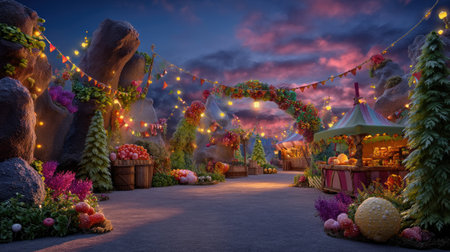 A vibrant evening market scene illuminated by colorful lights, featuring lush flora, decorative elements, and a whimsical atmosphere set in nature.
