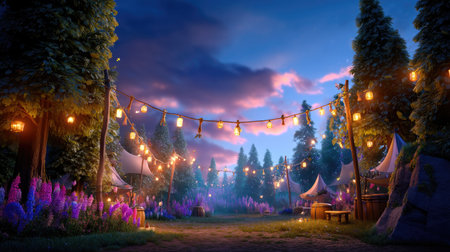 This enchanting night scene captures the essence of a magical forest setting filled with colorful lanterns and vibrant flowers, perfect for festivals.