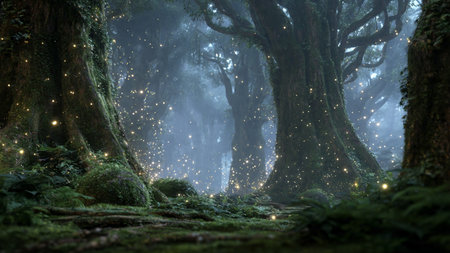 Breathtaking nature inspired background featuring a magical forest with fireflies illuminating a small waterfall at sunrise