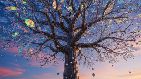 A fantasy tree with iridescent crystal leaves and sparkling dew drops against a colorful sky