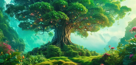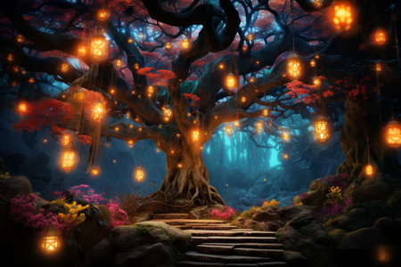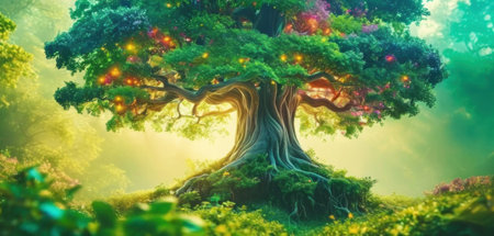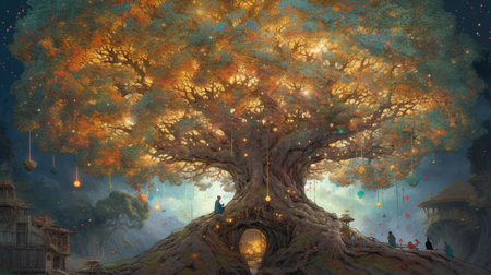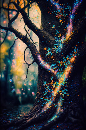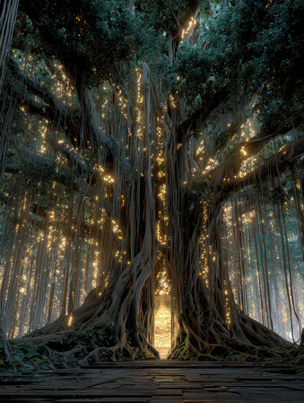 A mesmerizing scene of a giant enchanted tree with glowing lights, set in a mystical forest. This captivating image evokes feelings of magic and tranquility.