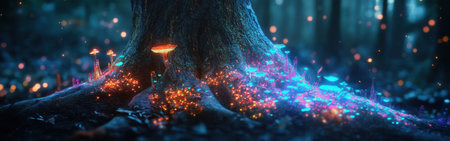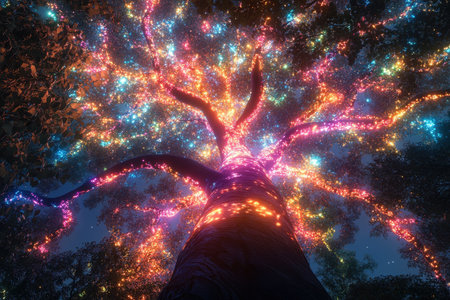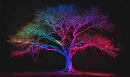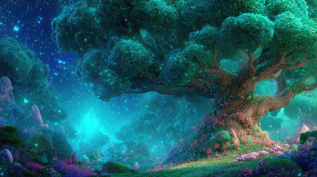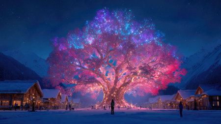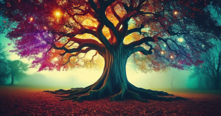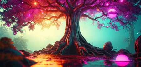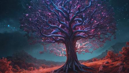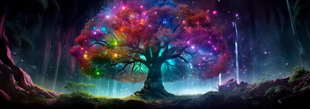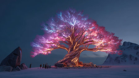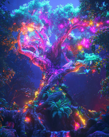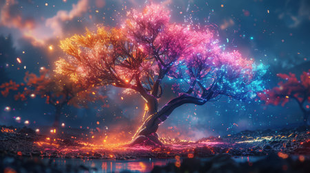 A mesmerizing scene of an enchanted tree illuminated by vibrant colors. This magical landscape captures the beauty of a surreal night, perfect for artistic projects.