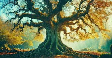 Fantasy depiction of a tree with radiant roots connecting to the earth, surrounded by glowing particles. Captures the essence of magical life energy in a detailed cinematic composition.
