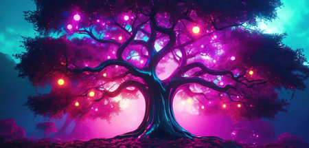 3D illustration of a beautiful fantasy tree in the garden with neon lights