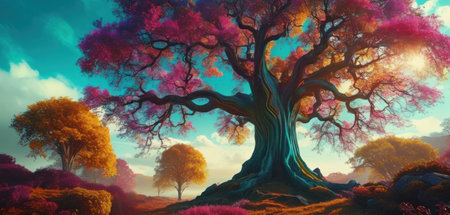 Beautiful fantasy landscape with old oak tree and colorful sky. Illustration