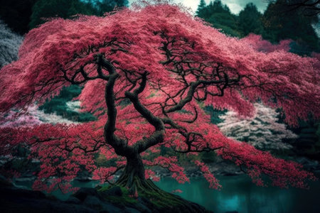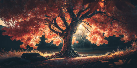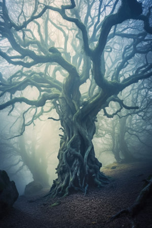 majestic tree surrounded by dark purple mist in magical forest, created with generative ai