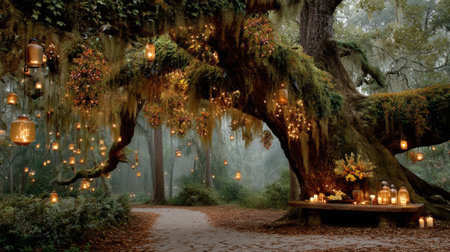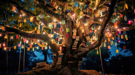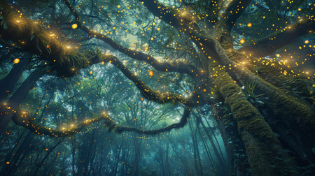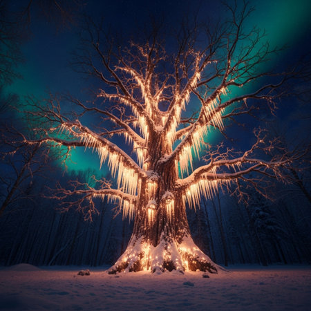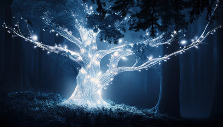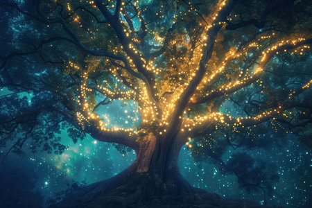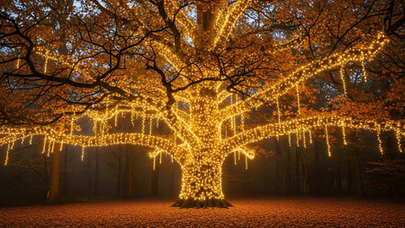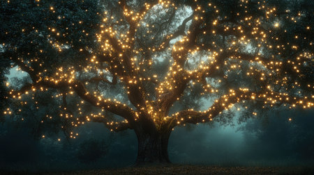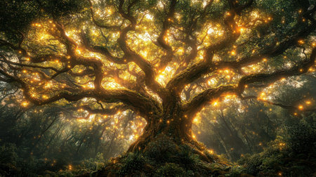 A magnificent tree draped in twinkling lights creates a breathtaking atmosphere in a tranquil forest, perfect for evoking feelings of serenity and enchantment.