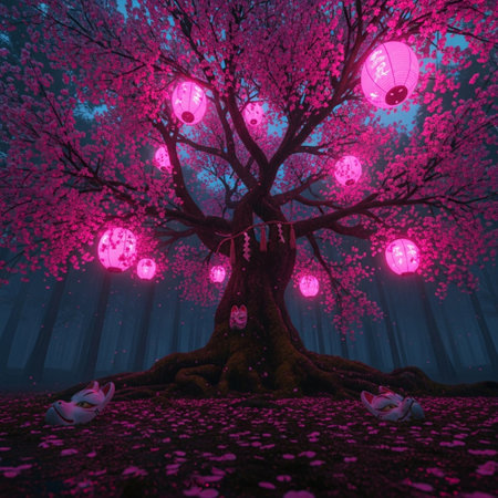 A stunning representation of a pink blossom tree bathed in an ethereal light under a starry night sky, showcasing nature's beauty and tranquility.