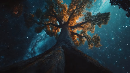 A tree trunk is seen from a low-angle perspective against a backdrop of a vibrant, starry night sky.
