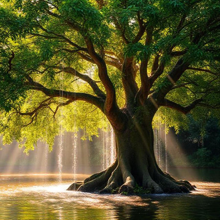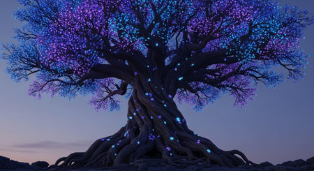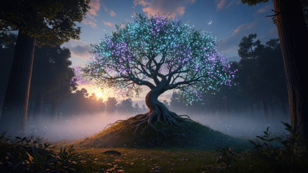 In a realm where ancient wisdom meets the digital frontier, a sacred tree glows with celestial light.