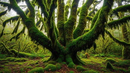 Bioluminescent moss covering ancient tree roots, glowing blue green in twilight