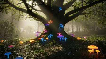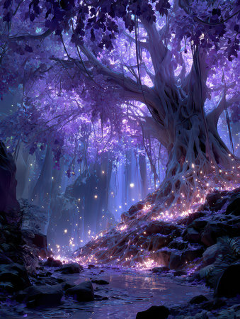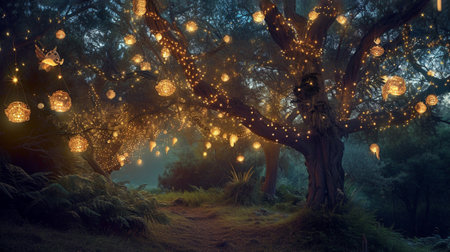 Discover a captivating enchanted forest featuring a majestic tree illuminated by ethereal lights, creating a magical atmosphere perfect for exploration and tranquility.