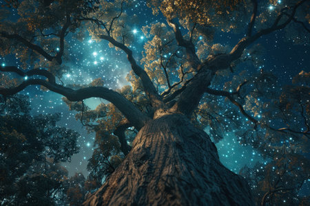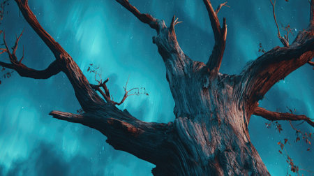 An aged tree with textured bark extends its branches against a soft teal gradient. The image presents a low angle shot with a cinematic style, emphasizing the intricate details of the tree. The background is reminiscent of a night sky. Suitable for illustrations, visual storytelling, and background designs.
