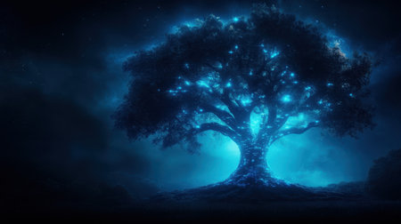 Enchanted forest scene at night. A large tree glows with ethereal blue light, its branches reaching towards a dark sky. Soft, grassy ground surrounds the tree, creating a mystical atmosphere. The image evokes a sense of wonder and tranquility.