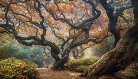 A breathtaking autumn forest scene. Twisted trees create a mystical path. A serene and enchanting atmosphere.