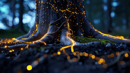 Twinkling lights adorn a tall tree, creating a whimsical glow in the dark forest, perfect for evening walks.