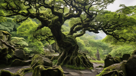 Majestic banyan tree with sprawling branches and roots in a tropical setting
