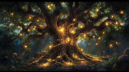 A massive ancient tree glowing with magical lights under the moonlight in a mystical forest. Twisting roots, thick branches, and sparkling orbs create a fairytale atmosphere. Ideal for fantasy themes, storytelling, mystical nature, and enchanted worlds.