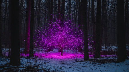 A scene unfolds in a dark, dense forest at night. A single tree stands as the focal point, completely adorned with vibrant purple fairy lights that cast an glow on its branches and the surrounding snowy ground. The deep shadows of the surrounding trees create a stark contrast with the luminous display, evoking a sense of magic, mystery, and wonder. transports the viewer to a surreal and fantastical woodland setting.