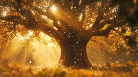 Majestic oak tree with glistening water drops falling from its branches, warm golden sunlight filtering through leaves generative ai