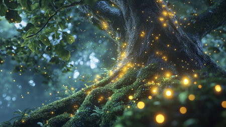 Glowing fireflies illuminate the roots and branches of an old tree in a tranquil forest at dusk.