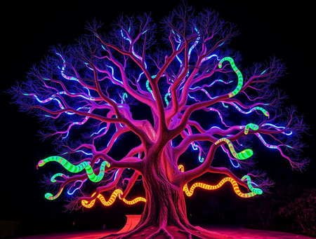 A stunning fantasy tree adorned with vibrant colorful lights illuminates a serene night landscape, creating a magical atmosphere that enchants visitors.
