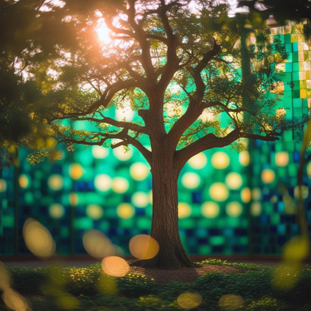 A vibrant tree is lit up, casting a soft glow on the ground, creating a tranquil nighttime ambiance for viewers.