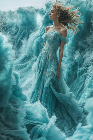 Elegant womans flowing gown merges with the sea