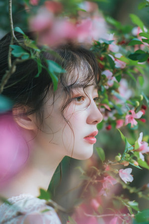 close up of asia beautiful young woman posing in forest