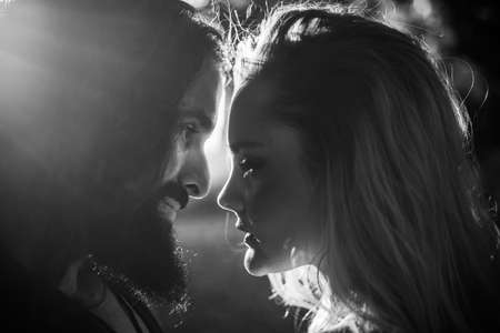 Young man gently hugging his fashionable woman, touch close up. Happy stylish couple embracing in autumn corn field in sunset light. Romantic sensual moment, black and white photo