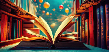 An enchanting image of an open book surrounded by floating particles, creating a whimsical atmosphere with a soft blue and orange bokeh background.