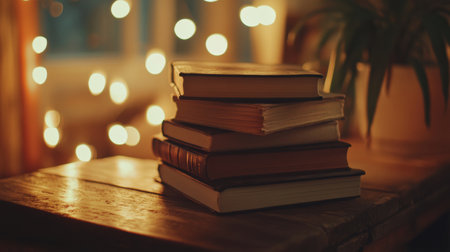 A stack of books is placed on a rustic wooden shelf, creating a warm and inviting atmosphere enhanced by softly glowing bokeh lights.