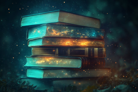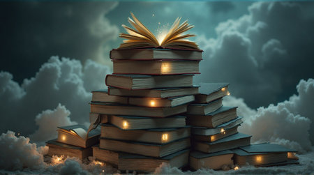 Magical stack of books with glowing pages and shimmering light against a cloudy sky