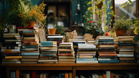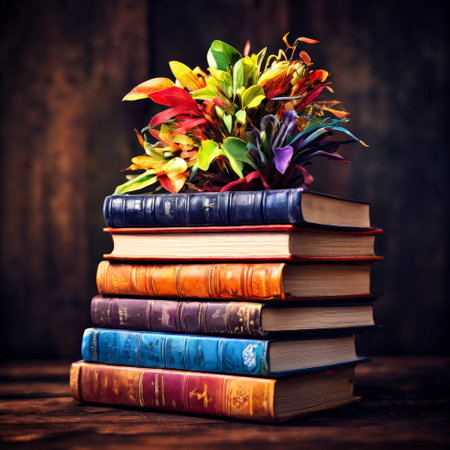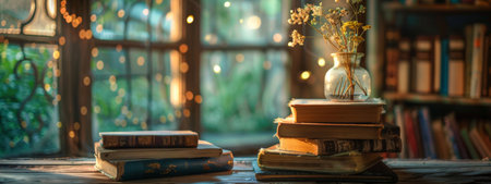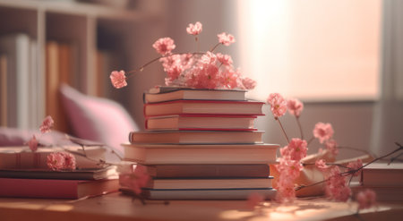 A close-up captures books and a floral display on a desk, bathed in soft light. The composition features various book sizes and colors alongside bright flowers. The scene, possibly indoors, suggests a study or workspace, suitable for illustrating educational or creative themes. These elements are suitable for editorial or commercial applications.