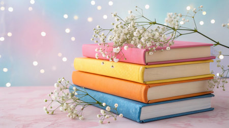 Colorful books decorated with green leaves and flowers. Overhead shot, vibrant colors, flat lay style. Ideal for education or springtime themes.