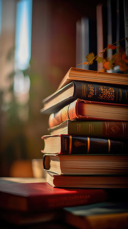 A stack of vintage books in a cozy room with warm natural light, creating a nostalgic and intimate atmosphere. Perfect for themes related to reading, knowledge, and vintage style.