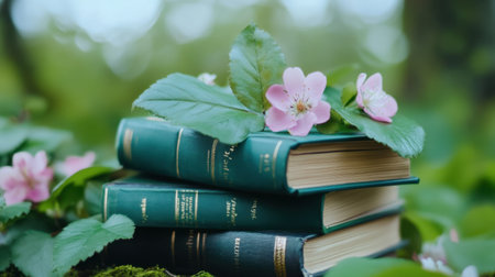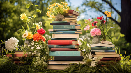 A beautiful arrangement of vintage books set amidst vibrant flowers and greenery, creating a serene and artistic atmosphere perfect for lovers of literature and nature.