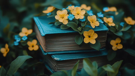 Bright yellow and blue flowers bloom around vintage books, creating a serene atmosphere that captures the essence of creativity and nature on World Poetry Day.