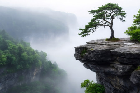 Majestic lone tree standing tall on a foggy cliffside, surrounded by mist and serene nature beauty.